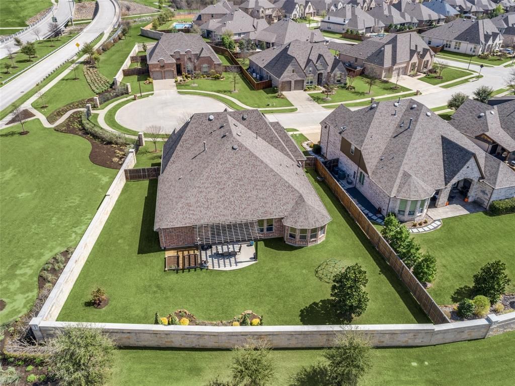 Perfect one-story Highland home with an open floor plan on a cul-de-sac lot overlooking the greenbelt. This well-maintained 4-bedroom, 3-bath home with a 3.5-car garage sits on a quarter-acre lot and features high ceilings throughout. The kitchen offers white cabinetry, double ovens, granite countertops, a large island, built-in desk, and walk-in pantry. Spacious breakfast nook with abundant natural light opens to the family room with soaring ceilings, stone fireplace, wood mantel, and large casement windows. Private office with built-ins and designer accent wall. Formal dining room is ideal for entertaining. Media room located at the rear of the home. Flex space between two bedrooms is perfect for an in-law or nanny suite. Hardwood floors throughout most of the home. Enjoy a private backyard with extended patio, pergola, and plenty of room for a pool or outdoor activities. Located in Trinity Falls with resort-style amenities including pools, clubhouses, fitness center, playgrounds, fishing lakes, parks, and more. Frazier Elementary located within the community.